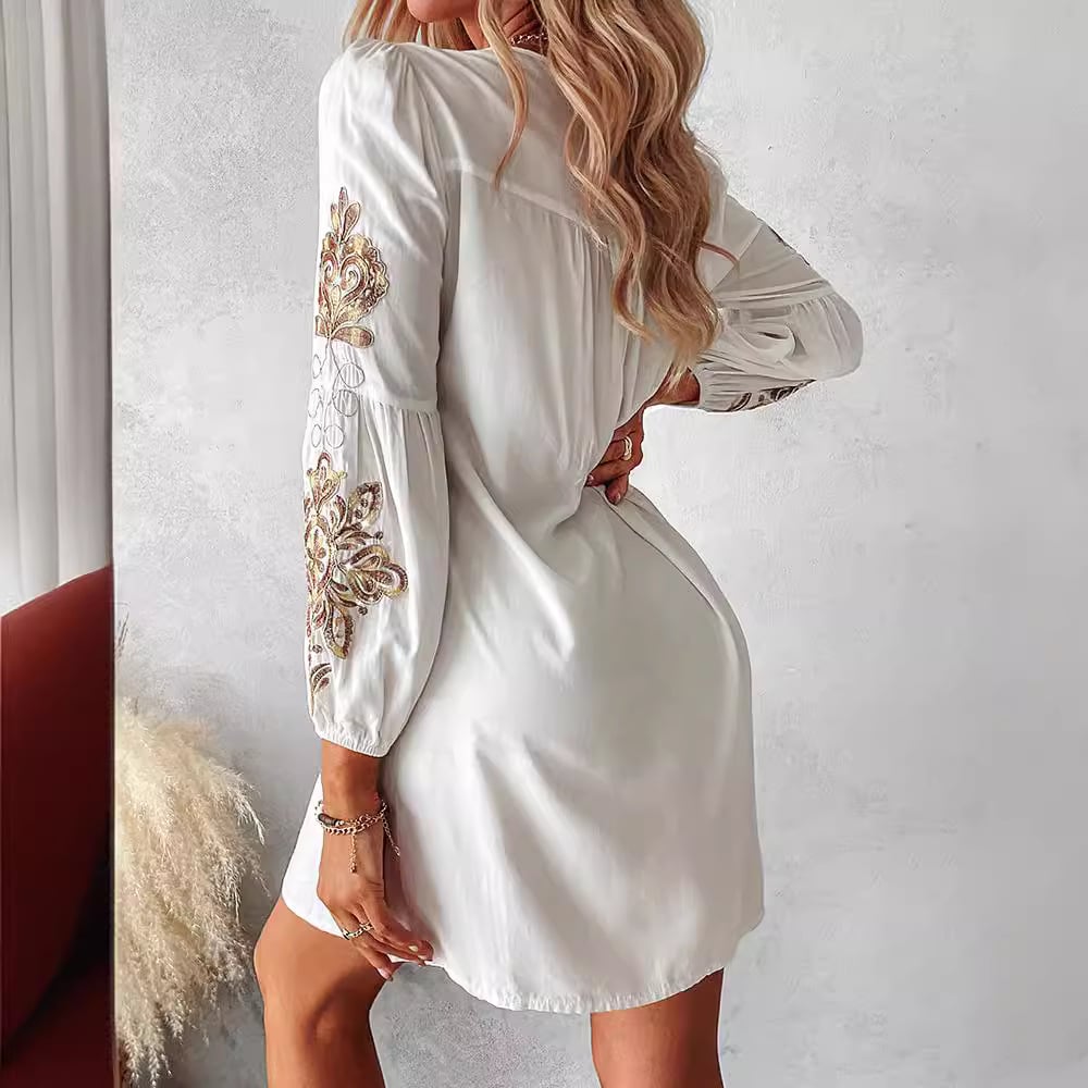 🌸 Ogarnij styl boho chic dzięki naszej damskiej sukience Boho z kwiatowym haftem i wiązanymi detalami! 🌼 Wyjątkowo eleganckie i wszechstronne na każdą okazję. Wyróżnij się kwiatową perfekcją! 🌺
